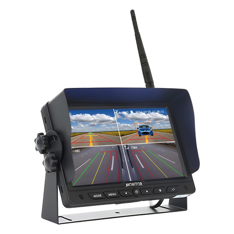 Carleader 7-tommers BSD Blind Spot Detection Wireless Monitoring System, et digitalt trådløst kamerasystem integrert med AI-deteksjonsfunksjon, støtter fotgjenger- og kjøretøydeteksjon og alarm, advarer sjåføren om kjøretøyets omgivelsessituasjon. Opptil 4 kanaler 720P trådløse kameraer automatisk sammenkobling, hver kanal støtter AI-deteksjonsfunksjon. Overvåk den innebygde AI-kalibreringsmenyen for å justere størrelsen på deteksjonsområdet i henhold til faktisk installasjonsposisjon og vinkel. Monitor Støtte valgfri funksjon for sløyfeopptak, støtte opptil 256 GB SD-kortlagring.