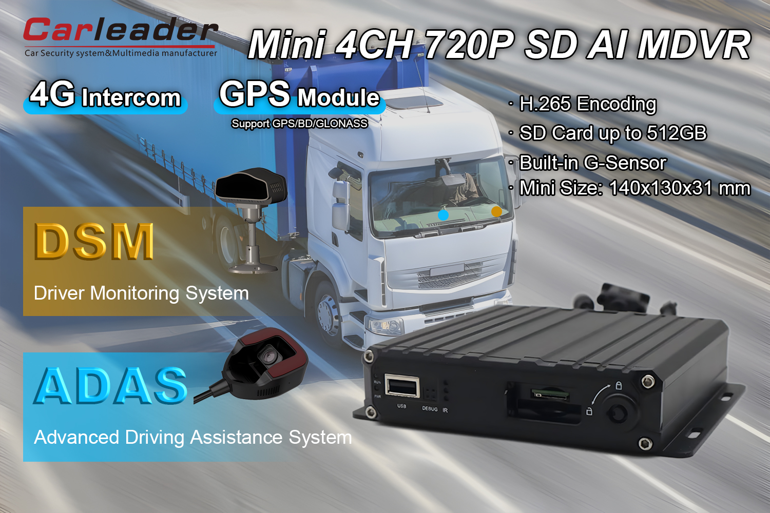 Leder4CH AI Intelligent Mobile DVR med DSM- og ADAS-kamera, en kompakt og høyytelses 4-kanalsOg mdvr(mobil digital videoopptaker) designet for moderne kjøretøyovervåking og sikkerhetsapplikasjoner. Ved å kombinere avanserte AI-egenskaper med robust maskinvaredesign, leverer denne enheten pålitelig sanntids bildeovervåking, opptak og intelligent analyse i en miniatyrisert formfaktor.