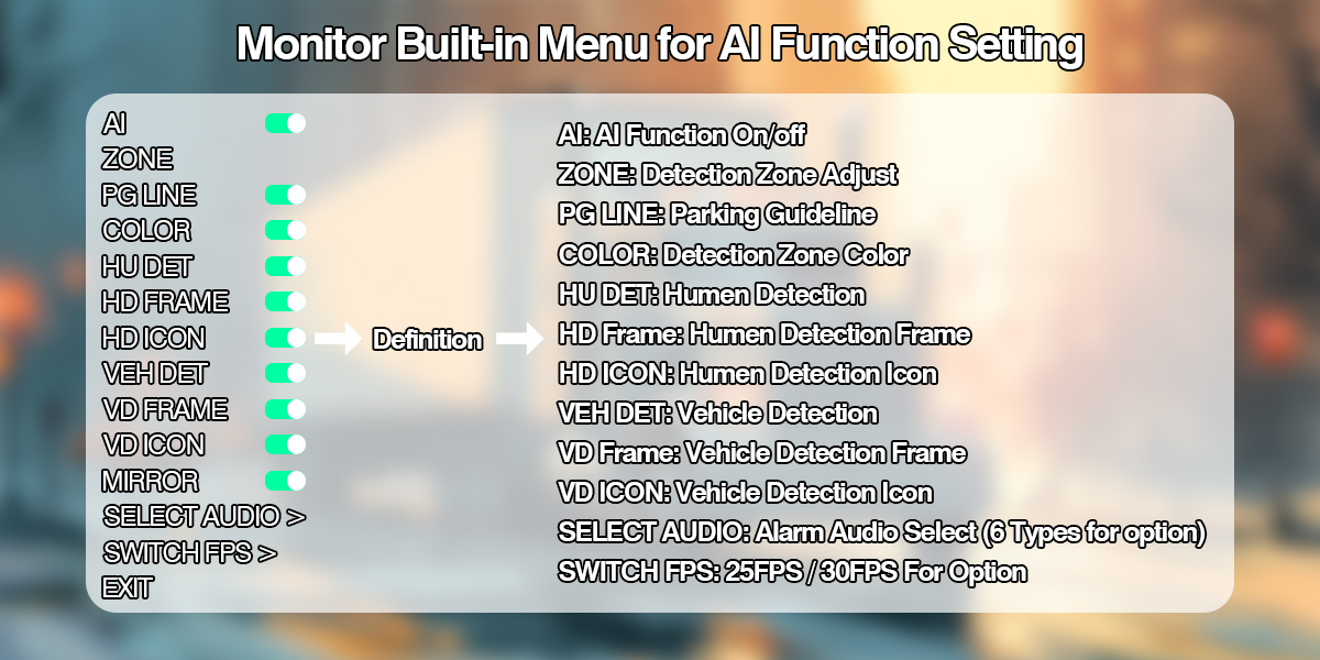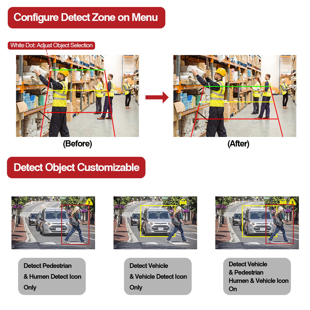 Overvåk innebygd AI-kalibreringsmeny, altBrukere kan fritt justere størrelsen på deteksjonsområdet (Detect Zone) på skjermen for å passe til forskjellige visningssituasjoner forårsaket av ulik monteringsposisjon og vinkel. Ved siden av justeringen av deteksjonsområde, er det flere AI-funksjoner som lar brukeren endre innstilling (Vennligst sjekk følgende bilde).