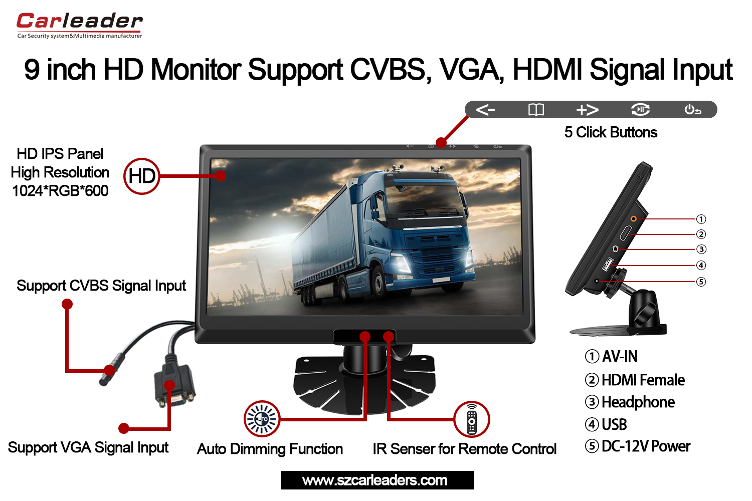 VårLeder9-tommers IPS-skjerm HD-skjermstøtte CVBS+HD+VGA-inngangerhar den beste videokvaliteten og klarheten av alle våre kjøretøymonitorer, og har 5 spesielle klikkknapper på toppen av skjermen, 9-tommers IPS-skjermstøtte for bilskjerm CVBS,HD,VGA er for øyeblikket på lager og i salg.