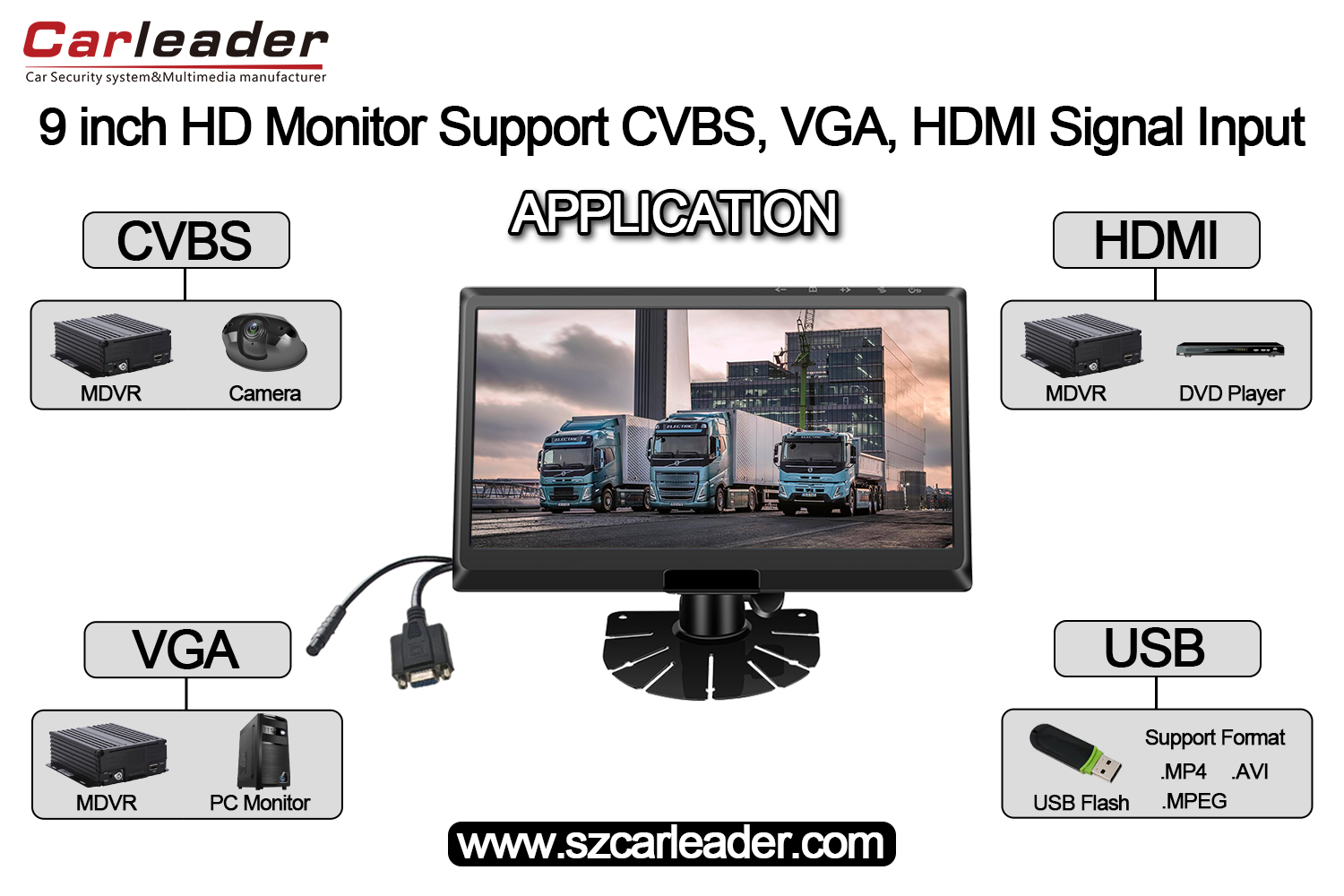 Leder9-tommers IPS-skjerm HD-skjerm Støtte CVBS+HD+VGA-inngangerer en høyytelses HD-skjerm designet for kjøretøyovervåking og MDVR-flåtestyring. Bilmonitoren støtter CVBS, HD og VGA-signalinnganger. Og hvis MDVR-en har VGA- eller HD-grensesnitt, kan den brukes med 9-tommers IPS-skjerm bilmonitor.