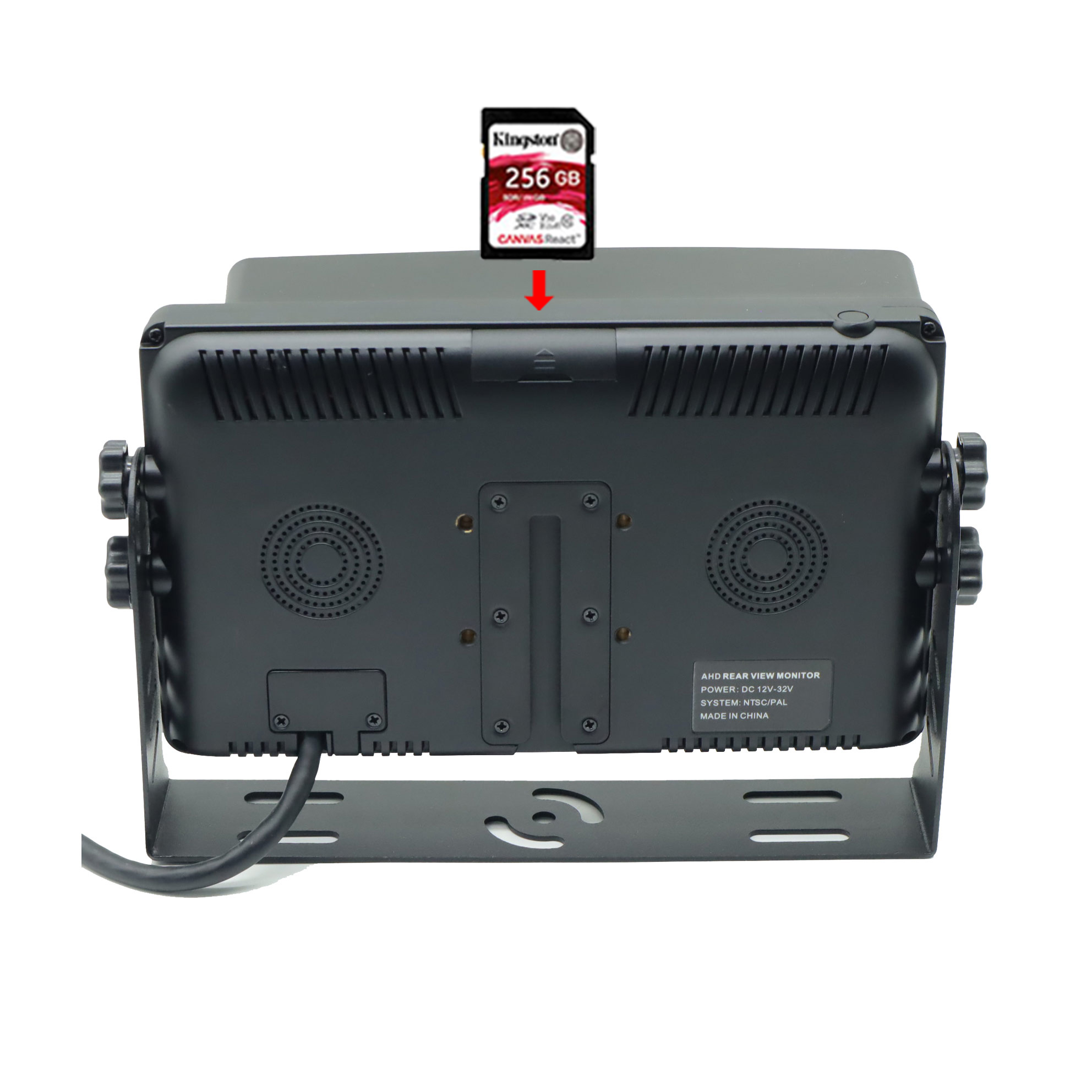 Carleader 7-tommers 4CH AHD-innganger Quad View Display Monitor støtter DVR-opptaksfunksjon, med SD-kortspor på baksiden av skjermen, maksimal kapasitet er opptil 256 GB. Funksjoner med loop-opptaksfunksjon, kan automatisk ta opp kameravideo og avspilling.
