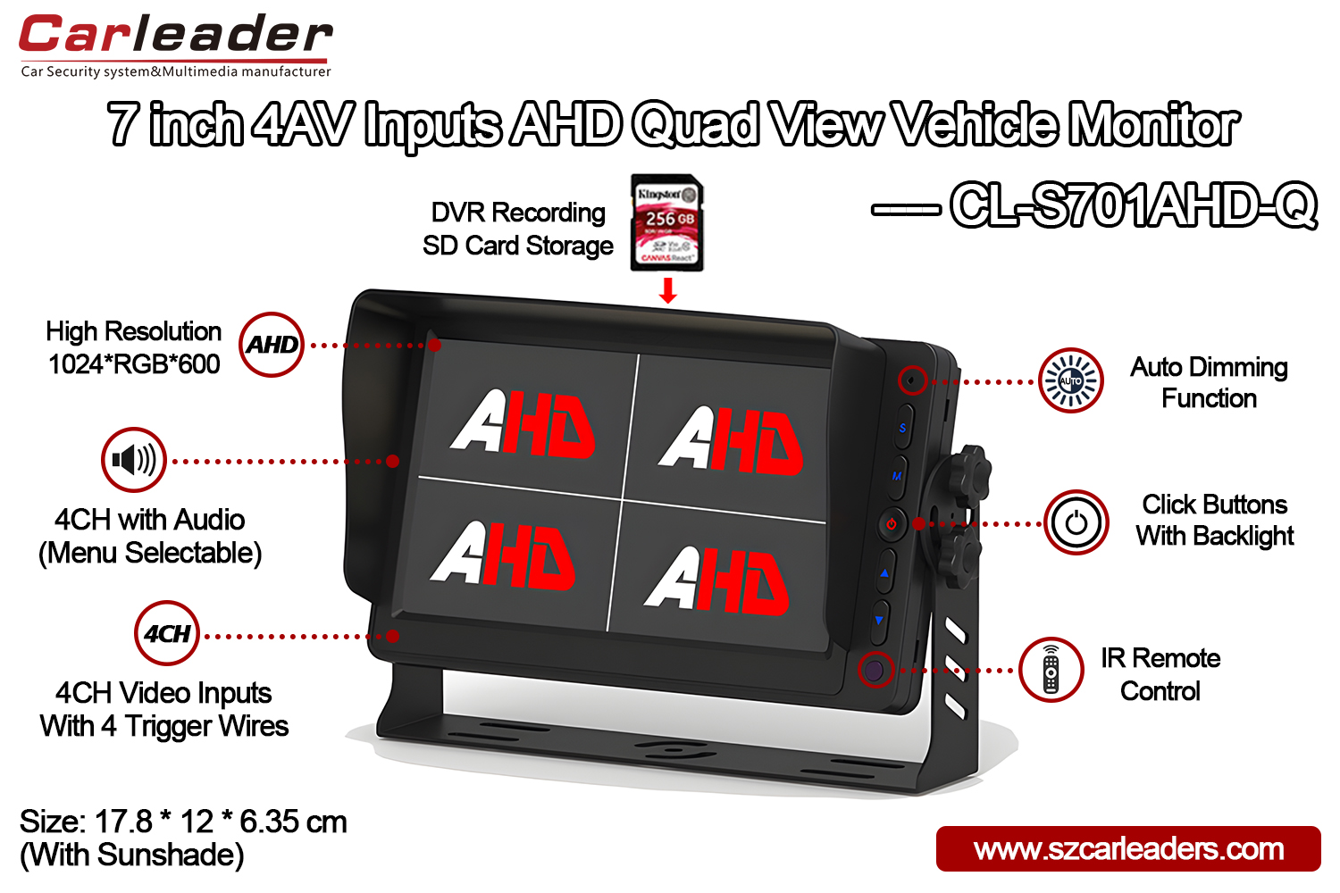 Carleader er stolte av å presentere deg vår7-tommers 4CH AHD-innganger Quad View Display Monitor, quad view-design kan støtte 4 kanaler for kjøretøykamera, for eksempel Front View, Side View x2, Rear View, lar sjåfører av store kjøretøy (busser, lastebiler og varebiler) overvåke flere visninger av omgivelsene mens de kjører kjøretøyet.