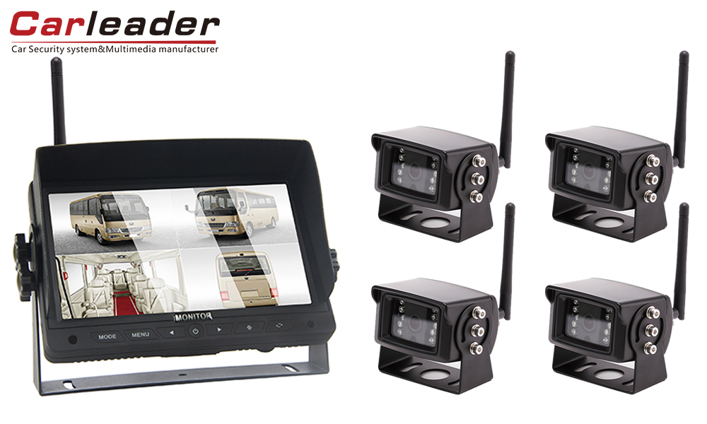 Leder7-tommers 2,4G digitalt trådløst 2CH-kamerasystem med delt skjerm, et trådløst overvåkingssystem med høy ytelse med støtte for 2 slips-skjermvisning, paring med 2 stk trådløst kamera. 7 tommers digitalt panel, 16 : 9 bildeforhold, 1024 x 600 (RGB) oppløsning, gir føreren høy klarhet i kjøreopplevelsen.