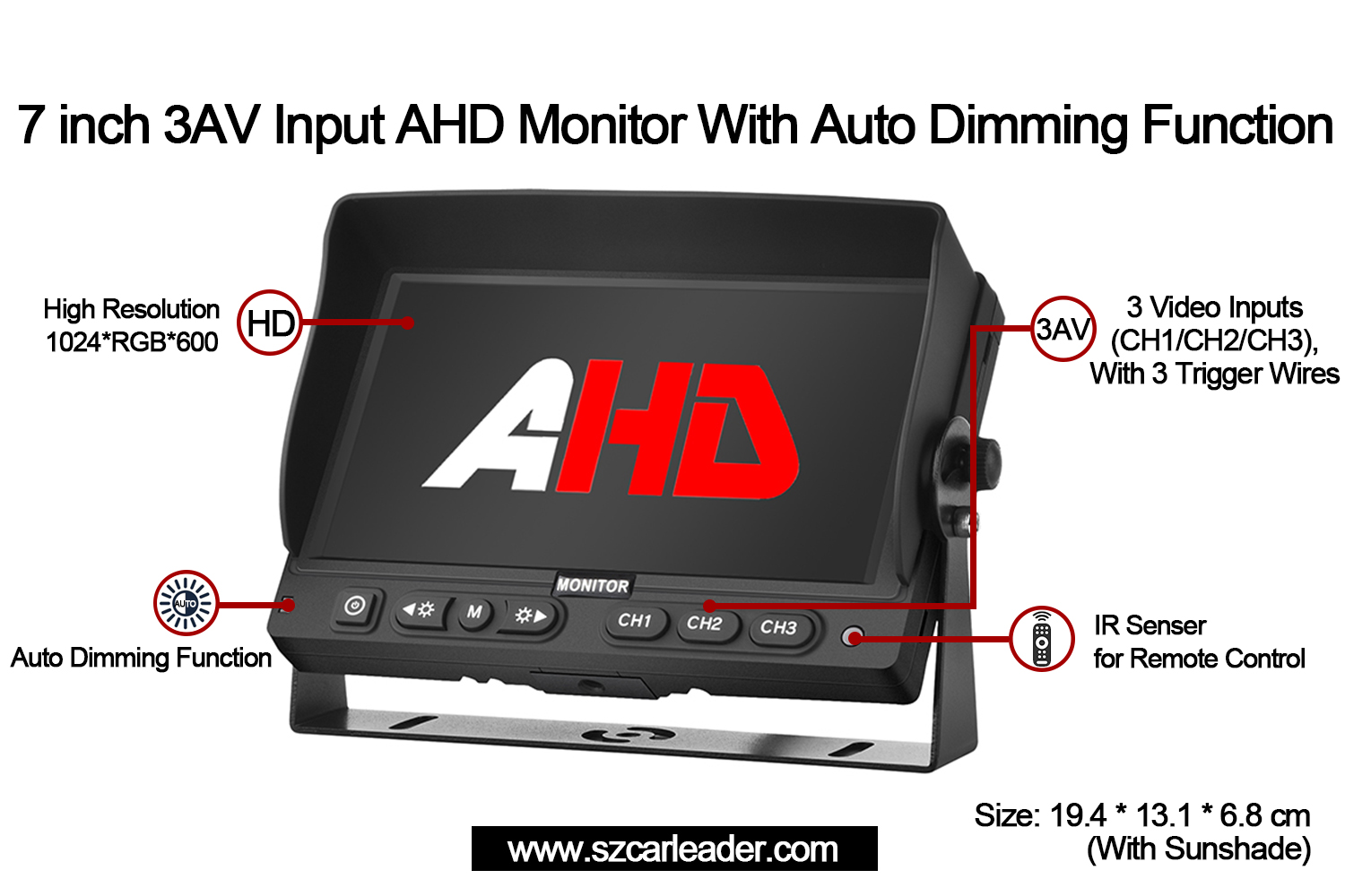 Perfekt for flåtestyring, sikkerhetsovervåking eller industriell bruk, Carleader7-tommers 3CH AHD-innganger Vehicle Backup Monitorkombinerer pålitelighet, allsidighet og brukersentrert innovasjon i en kompakt form.