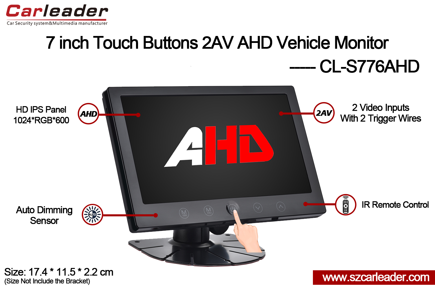 Leder7 tommers IPS-skjerm 2CH AHD-inngang berøringsknapper Monitor for tunge kjøretøyideell for bil-, sikkerhets-, marine- og industribruk, denkombinerer holdbarhet, fleksibilitet og skjermytelse av høy kvalitet i én pålitelig pakke.